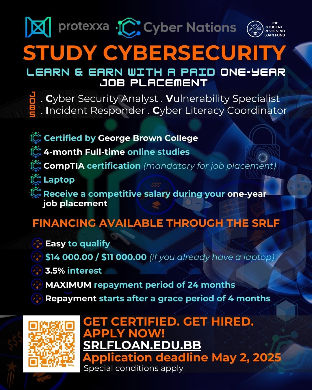 Ready to jumpstart your career in one of the fastest-growing industries? The Cyber Nations Cybersecurity Training & Job Placement Program equips you with the skills to secure high-demand roles! Gain industry-leading training through George Brown College with affordable financing from the Student Revolving Loan Fund.
